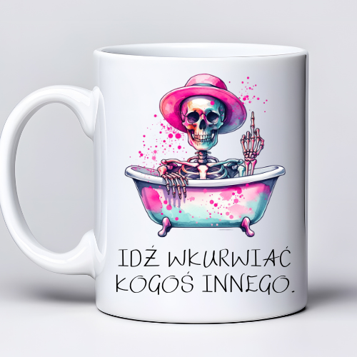 Kubek 330 ml z tekstem „Idź wku#wiać kogoś innego.” i grafiką szkieletu w wannie**