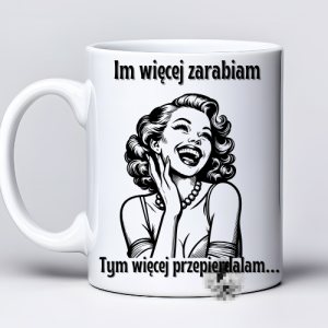Kubek 330 ml z tekstem: „Im więcej zarabiam, tym więcej przepie*dalam” i grafiką śmiejącej się kobiety w stylu retro