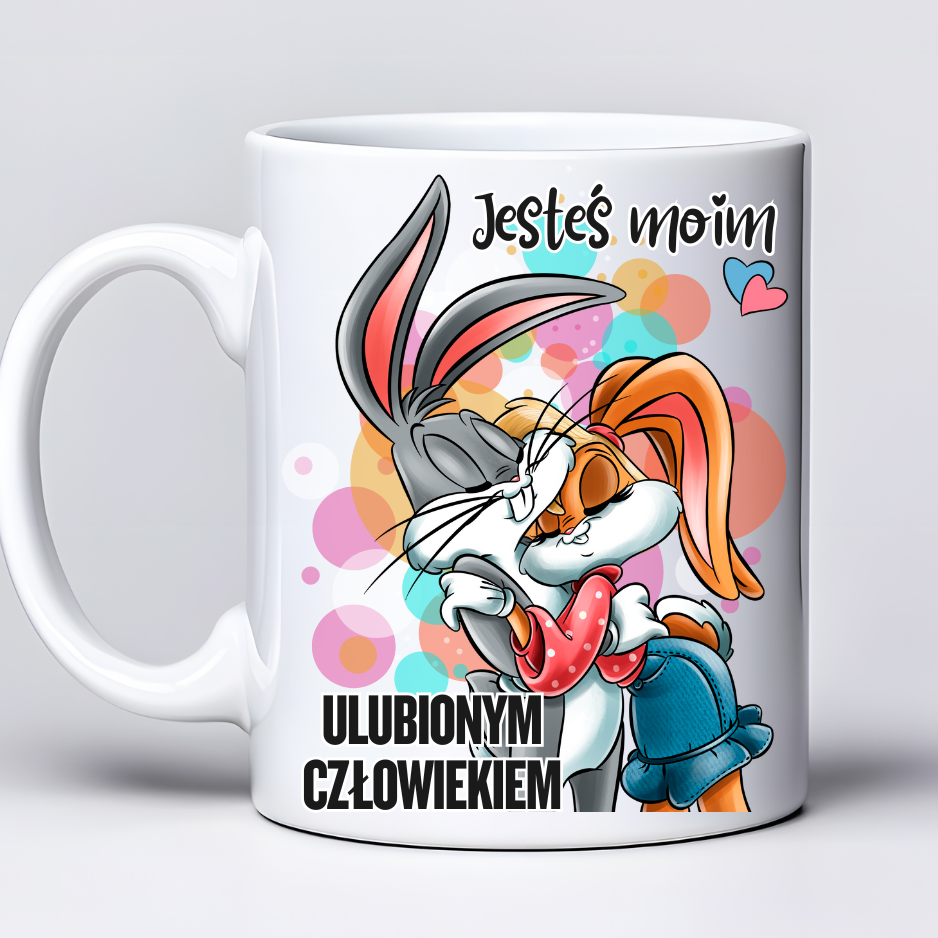 Ten kubek to połączenie humoru, uroku i czułości w jednym. Grafika przedstawia przytulonego Królika Bugsa i Lola – symbol przyjaźni i ciepła – a napis „Jesteś moim ulubionym człowiekiem” dodaje osobistego charakteru. Wykonany w technologii sublimacji, dzięki czemu grafika jest trwała, odporna na ścieranie i zachowuje intensywne kolory nawet po wielu myciach w domowej zmywarce. Kubek pomieści 330 ml ulubionego napoju i jest idealny na poranną kawę, herbatę lub kakao. To świetny sposób, aby codziennie przypominać komuś, że jest wyjątkowy.