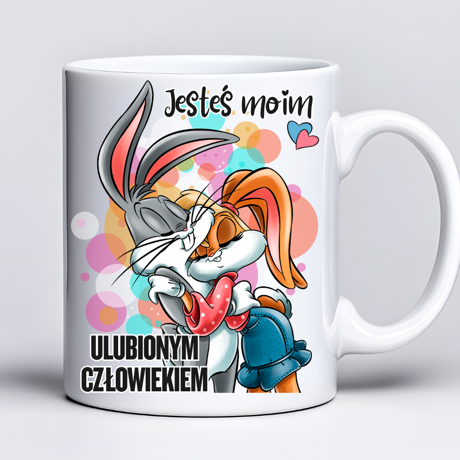 Kubek 330 ml z tekstem: „Jesteś moim ulubionym człowiekiem” i grafiką przytulonych Królika Bugsa i Lola