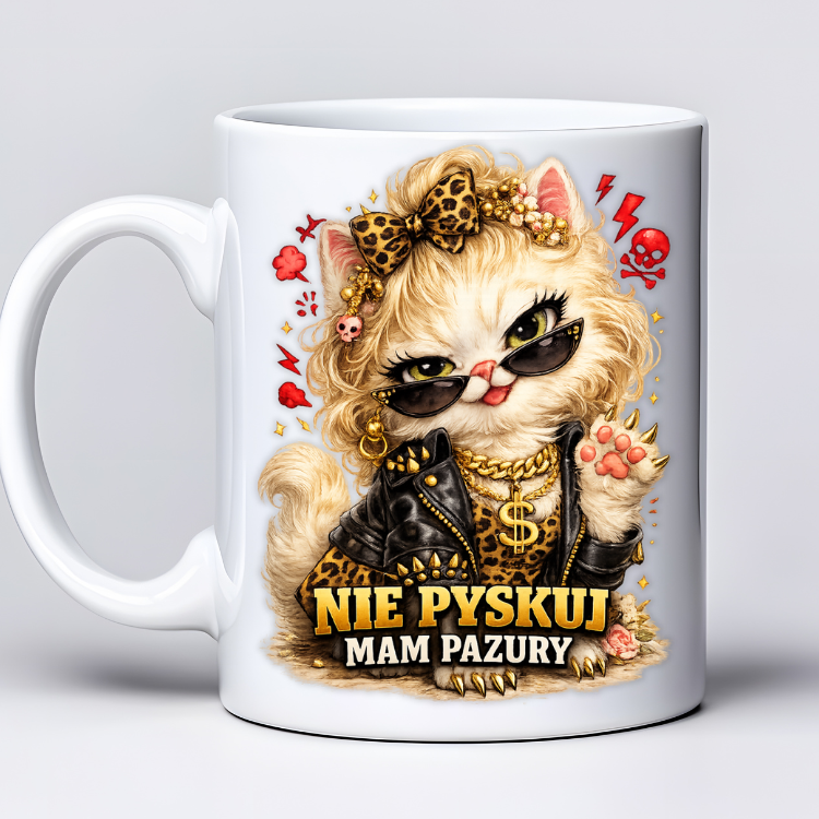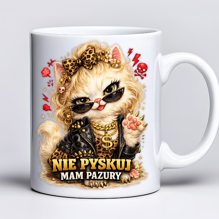 Kubek 330 ml z tekstem „Nie pyskuj mam pazury” i grafiką zadziornej kotki w stylu glamour