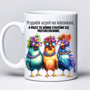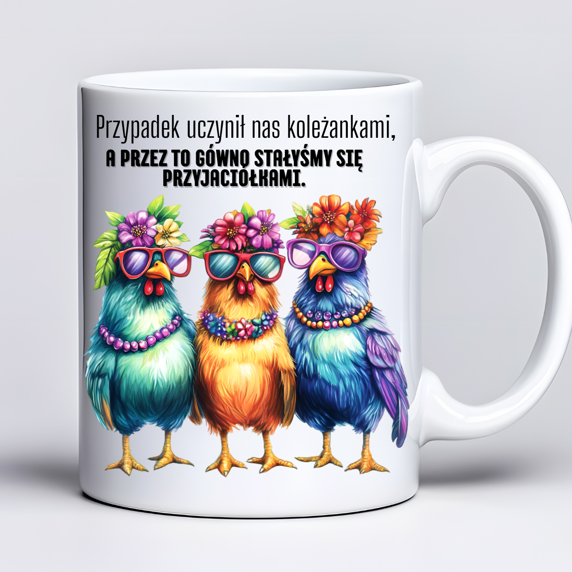 Kubek 330 ml z tekstem „Przypadek uczynił nas koleżankami, a przez to gówno stałyśmy się przyjaciółkami” i grafiką 3 kur