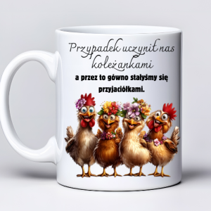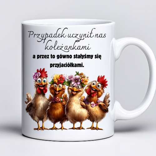 Kubek 330 ml z tekstem „Przypadek uczynił nas koleżankami, a przez to gó#wno stałyśmy się przyjaciółkami” i grafiką czterech zabawnych kur