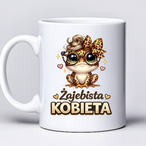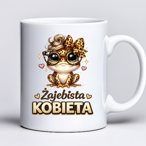 Ten kubek to połączenie humoru, uroku i mocnego przekazu. Napis „Zajebista Kobieta” w zestawieniu z uroczą grafiką żabki w panterkowym stylu tworzy zabawny i bardzo charakterystyczny design, który od razu przyciąga uwagę.