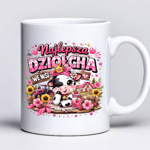 Kubek 330 ml z tekstem Najlepsza Dziołcha we wsi i grafiką uroczej krówki – śmieszny prezent dla kobiety