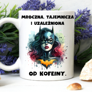 Kubek sublimowany 330 ml z Batwoman i napisem „Mroczna, tajemnicza i uzależniona od kofeiny”