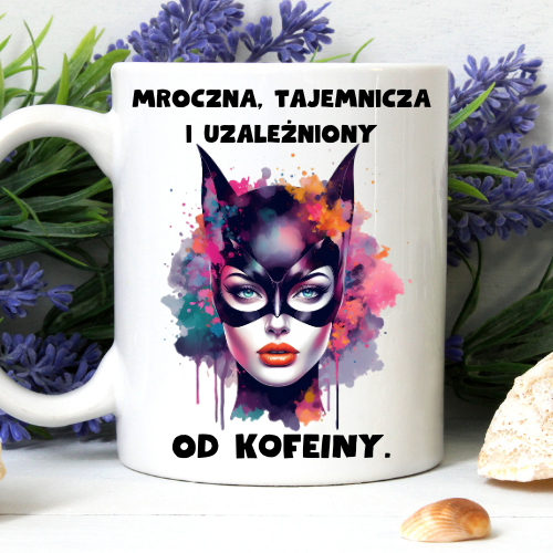 Kubek sublimowany 330 ml z Catwoman i napisem „Mroczna, tajemnicza i uzależniona od kofeiny”.