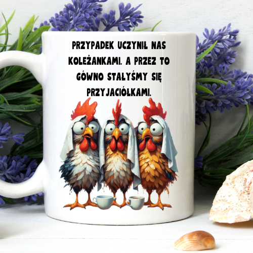Kubek sublimowany 330 ml z kurami i napisem „Przypadek uczynił nas koleżankami, a przez to gówno stałyśmy się przyjaciółkami” to idealny gadżet dla kobiet, które uwielbiają sarkastyczny humor i mają silne więzi przyjaźni.