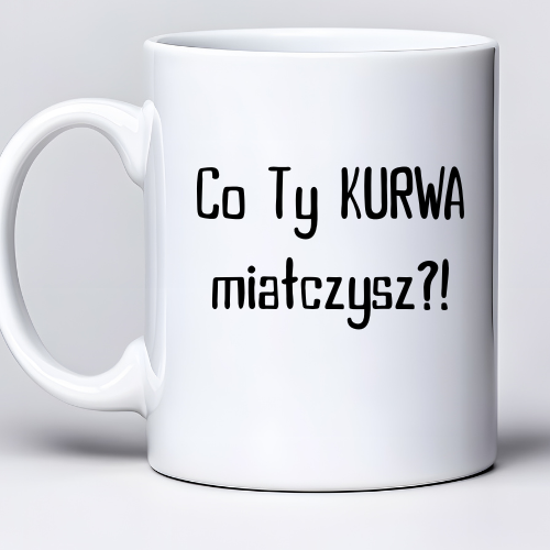 Kubek sublimowany o pojemności 330 ml z napisem „Co Ty kur** miałczysz…?”