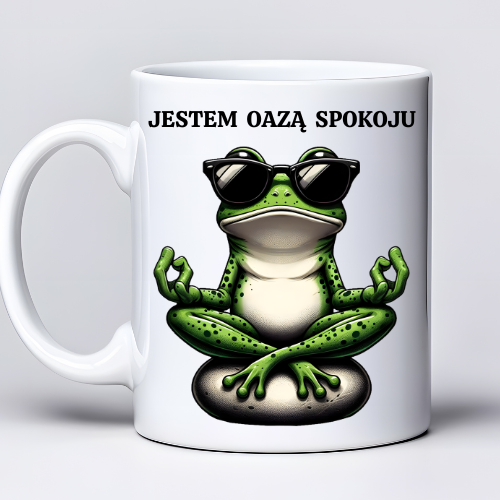 Kubek z nadrukiem 330 ml z medytującą żabą i napisem „Jestem oazą spokoju” po jednej stronie oraz „Pierdolonym kurwa zajebiście wyciszonym kwiatem lotosu na zajebiście spokojnej tafli jebanego jeziora. Jestem wręcz jak jebany wagon pełen pierdolonych medytujących tybetańskich mnichów”* po drugiej to prawdziwy majstersztyk humoru i zen w jednym.
