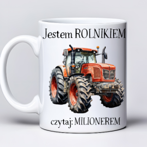 Kubek z nadrukiem 330 ml – traktor i napis „Jestem rolnikiem (czytaj: milionerem) / Zapraszam do mojej stodoły…”