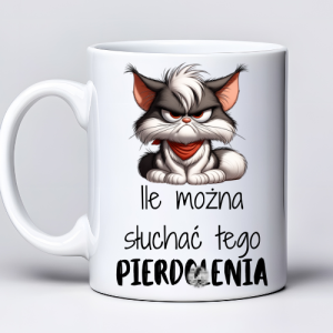 Kubek z nadrukiem 330 ml z kotem i napisem „Ile można słuchać tego pierd*lenia”