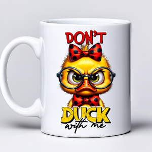 Kubek z nadrukiem 330 ml z grafiką kaczki i zabawnym angielskim tekstem „don't DUCK with me” to świetny prezent dla osób, które uwielbiają humor, sarkazm i wyjątkowe kubki do domu lub pracy.