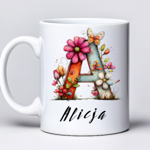Kubek z nadrukiem 330ml z imieniem Alicja i literą A w kwiatowym stylu ersonalizowany kubek dla niej z możliwością zmiany imienia na literę A
