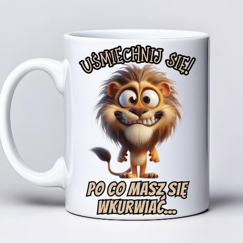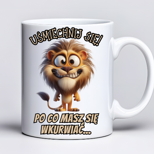 Kubek śmieszny z motywem lwa i humorystycznym napisem to idealny sposób na poprawę nastroju. Kolorowa grafika przyciąga uwagę i świetnie prezentuje się na biurku lub w kuchni. To doskonały pomysł na prezent dla znajomego, współpracownika lub bliskiej osoby. Kubek ceramiczny 330 ml sprawdzi się do kawy, herbaty i codziennych napojów. Trwały nadruk sublimacyjny zapewnia intensywne kolory i estetyczny wygląd przez długi czas.